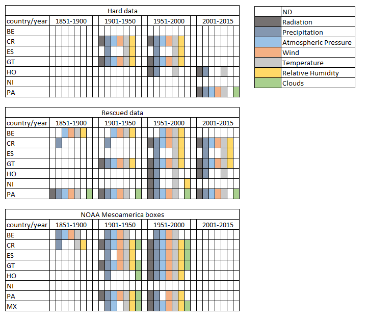 The Mesoamerican initiative aims to recover historical weather observations across countries from southern Mexico to Panama including Costa Rica, Nicaragua, Honduras, El Salvador, Guatemala and Belize. The group is currently composed of representatives of the following institutions and growing:-El Salvador    -MARN (Ministry of Agriculture and Natural Resources, Rosa Maria Araujo, raaujo@marn.gob.sv)-Guatemala    -INSIVUMEH (National Institute of Sismology, Vulcanisms, Meteorology and Hydrology; Eddy Hardie Sanchez Benett, indireccion@insivumeh.gob.gt )    -ANACAFE (National Association of Coffee Growers)-Honduras    -SMN (National Meteorological Service, Francisco J. Argenal, fjargenal@gmail.com )-Panama    -ETESA (Electrical Transmission Enterprise, Edilberto Esquive, eesquivel@etesa.com.pa)-Costa Rica:    -CATIE (Tropical Agricultural Research and Higher Education Center, www.catie.ac.cr)    -ICE (National Institute of Electricity, Granados Calderón Jorge A, Coordinador Area de Hidrologia, jgranados@ice.go.cr, ) ACRE-MESOAMERICA DATABASE SUMMARY-Scanned and hard data year's range:    -Belize: 1886 -1967    -Costa Rica: 1888-2013    -El Salvador: ND-1970    -Guatemala: 1900-1970    -Honduras: 1955-2010    -Panama: 1897-1905 -Variables  SCANNED and HARD DATA:    -Belize: barometer, wind, atmosphere, elevation, relative humidity, vapour pressure, thermometer    -Costa Rica: precipitation, days with rain, temperature, relative humidity, evaporation, solar brightness, atmospheric pressure, wind direction, radiation, elevation    -El Salvador: elevation, temperature, relative humidity, precipitation    -Guatemala: precipitation, temperature, atmospheric pressure, realtive humidity, wind, evaporation, insolation, ground state.    -Honduras: solar brightness, precipitation, temperature    -Panama: Barometer, temperature, wind, cloud, weather, rain, solar radiation. DATA DETAILS-Belize Data:    -SCANNED_DATA: bank of historic climate registers between 1886 to 1967 in JPG format (for typing) .-Costa Rica Data:    -HARD_DATA(.pdf, images):letters to contributors, some photos of cellars with data and precipitation historic records, book "Apuntaciones sobre el clima de Costa Rica" H. Pittier 1890.    -SCANNED_DATA:  scanned files in pdf with historical records of yearbooks and newsletters-El Salvador Data:    -HARD_DATA(.pdf, images): letters to contributors, some photos of cellars with climate data records -Guatemala Data:    -HARD_DATA(.pdf, images): letters to contributors, pdf with photos of cellars with climate data records since 1900    -SCANNED_DATA: Daily data in pdf files from the National observatory of Guatemala, years 1948,49,50,68,69,70-Honduras Data:    -HARD_DATA(.pdf, images): letters to contributors,  photos of cellars with climate data records since 60 years ago -Panama Data:    -HARD_DATA(.pdf, images):letters and post to contributors, photos of the boxes containing the graphs of the meteorological variables, photos of historical records Colon Panama between 1897-1905, download link for climatological data     from panama in ETESA site (http://www.hidromet.com.pa/index.php)     -RESCUED_DATA(.xlsx): Excel file with downloaded data from ETESA websiteOTHER SOURCES-Cuba Data *:    La Marina daily newspaper for 1845 to 1883 and centenary compilation (1832 - 1932) with climatological data.
