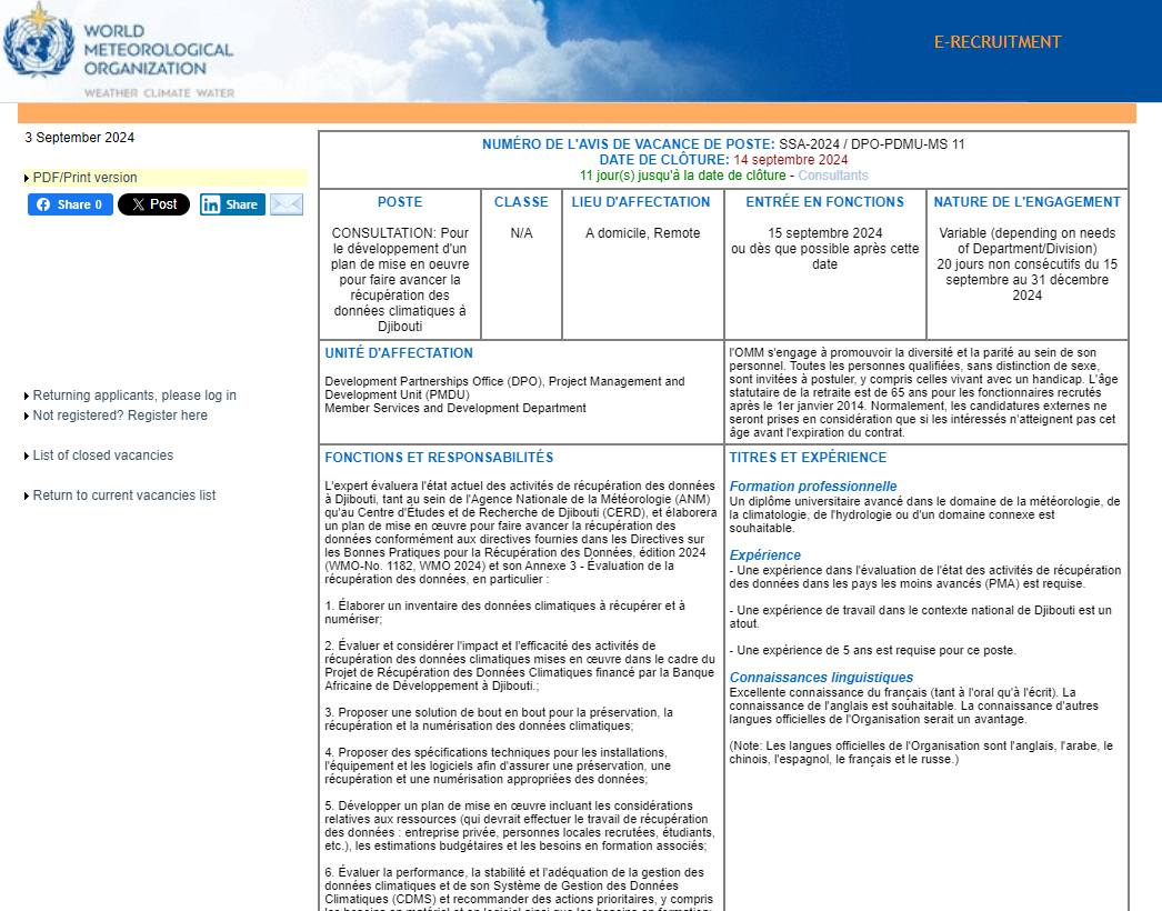 L'OMM a ouvert un poste de consultant pour la récupération des données à Djibouti. L'expert évaluera l'état actuel des activités de récupération des données à Djibouti, tant au sein de l'Agence Nationale de la Météorologie (ANM) qu'au Centre d'Études et de Recherche de Djibouti (CERD), et élaborera un plan de mise en œuvre pour faire avancer la récupération des données conformément aux directives fournies dans les Directives sur les Bonnes Pratiques pour la Récupération des Données, édition 2024 (WMO-No. 1182, WMO 2024) et son Annexe 3 - Évaluation de la récupération des données.